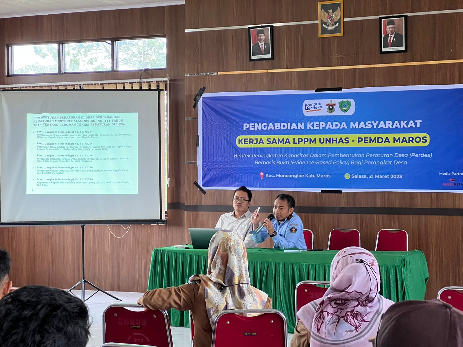 MAROS, EDUNEWS.ID – Tim pengabdian masyarakat Lembaga Penelitian dan pengabdian masyarakat (LPPM) Universitas Hasanuddin (Unhas) bekerja sama pemerintah kecamatan Moncongloe kabupaten Maros menggelar bimbingan teknis (bimtek) peningkatan kapasitas dalam pembentukan peraturan desa (Perdes) berbasis bukti. Kegiatan ini diadakan di kantor Kecamatan Moncongloe, Maros (21/3/2023).