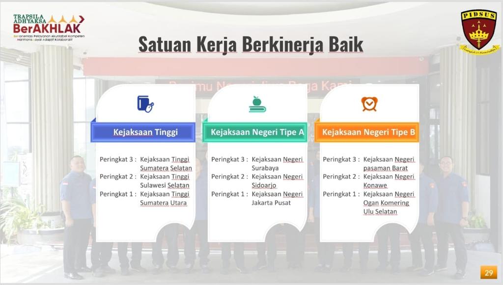“Terutama bidang Tindak Pidana Khusus yang telah berupaya bekerja keras, bekerja cerdas, bekerja cepat, bekerja tepat, dan bekerja dengan tuntas dalam penanganan perkara tindak pidana korupsi di Sulawesi Selatan,” ujarnya.