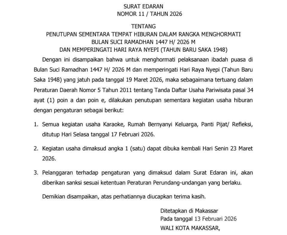 Pengaturan ini mengacu pada Peraturan Daerah Kota Makassar Nomor 5 Tahun 2011 tentang Tanda Daftar Usaha Pariwisata, khususnya Pasal 34 ayat (1) poin a dan poin e. Dengan sinergi antara pemerintah, pelaku usaha, dan masyarakat, suasana Ramadan dan Nyepi tahun ini diharapkan berlangsung aman, tertib, dan penuh kekhidmatan.