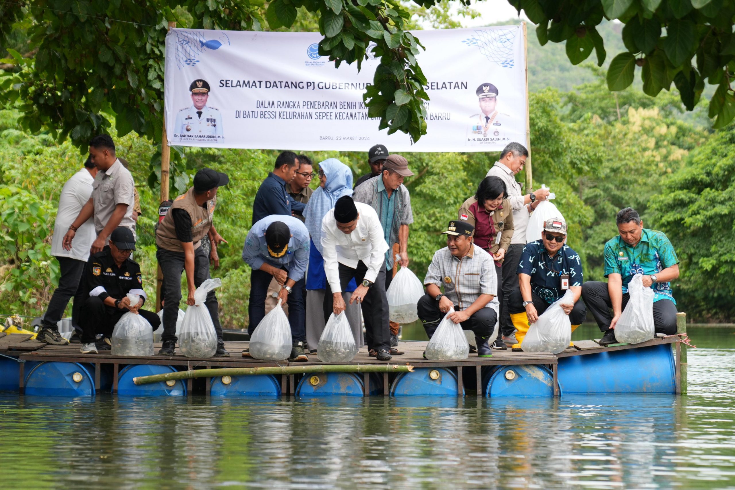 Benih ikan tersebut ditebar Pj Gubernur Bahtiar Baharuddin didampingi Bupati Barru Suardi Saleh, dan jajaran Forkopimda Kabupaten Barru. Selain itu, juga diserahkan bantuan ikan nila kepada dua kelompok budidaya, masing-masing Nepo Youth Fish dan Sipurennu.