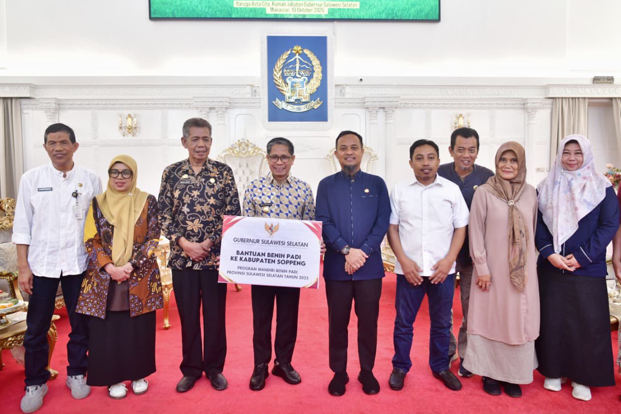 MAKASSAR, EDUNEWS.ID – Gubernur Sulawesi Selatan, Andi Sudirman Sulaiman, secara simbolis menyerahkan bantuan mandiri benih padi untuk musim tanam Oktober 2025–Maret 2026 kepada Kabupaten Soppeng dan Sidrap.
