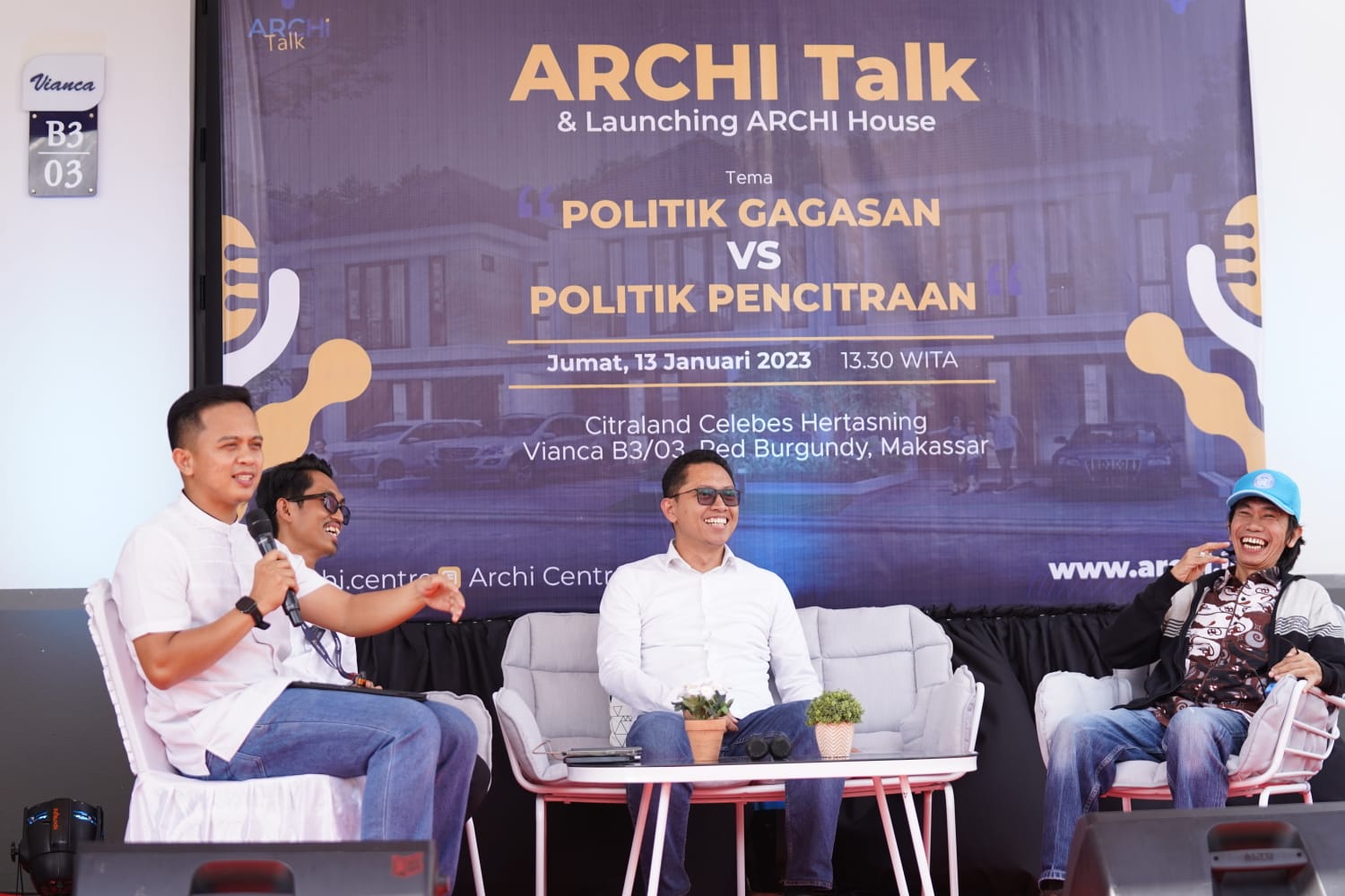 Peresmian ARCHI House Makassar tersebut diawali dengan dialog politik “Architalk” dengan mengangkat tema “Politik Gagasan VS Politik Pencitraan”, hadir selaku narasumber CEO Archi Mukhradis, Analis Politik dan Kebangsaan Dr. Arqam Azikin, Content Creator Rijal Djamal, dan Moderator sekaligus COO Archi, H. Muh. Fitriady.