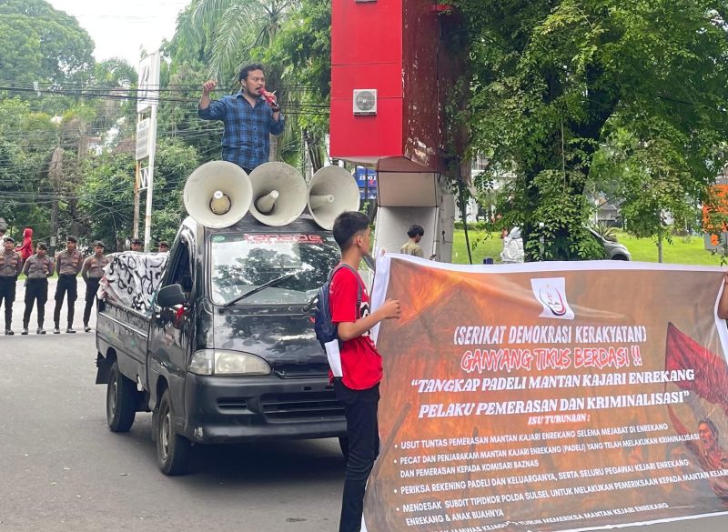 MAKASSAR, EDUNEWS.ID– Sejumlah massa yang tergabung dalam Serikat Demokrasi Kerakyatan Sulawesi Selatan (SIDIK SULSEL) menggelar aksi unjuk rasa serentak di depan Kantor Kejaksaan Tinggi (Kejati) Sulawesi Selatan dan Polda Sulawesi Selatan pada hari Rabu, 3 Desember 2025. Aksi ini menuntut penangkapan Padeli, mantan Kepala Kejaksaan Negeri (Kajari) Enrekang, atas dugaan tindak pidana pemerasan dan kriminalisasi.