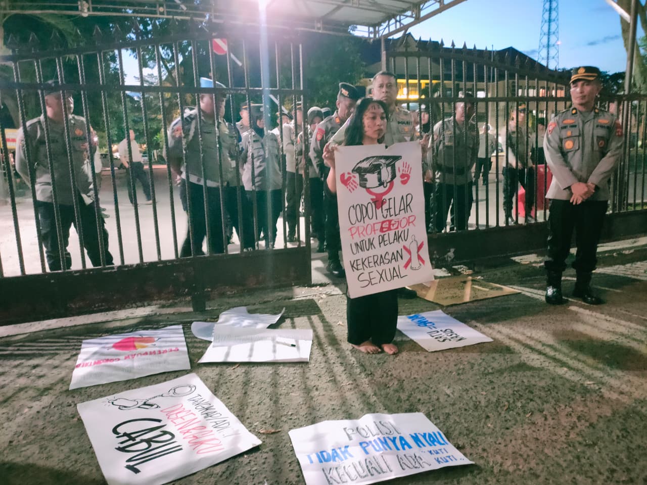 Seorang peserta aksi berdiri di depan barisan polisi, membawa poster tuntutan pencopotan gelar pelaku kekerasan seksual. (Foto: Faradila Alim)