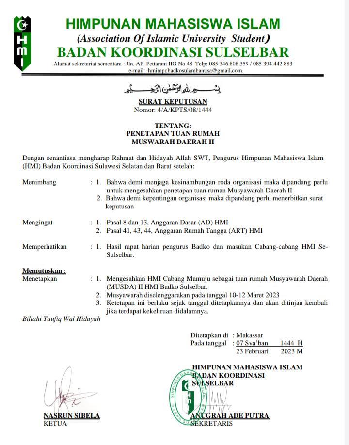 Penetapan HMI Cabang Mamuju selaku Tuan Rumah Musda berdasarkan hasil rapat harian Pengurus Badko serta masukan cabang-cabang HMI di wilayah Sulselbar.