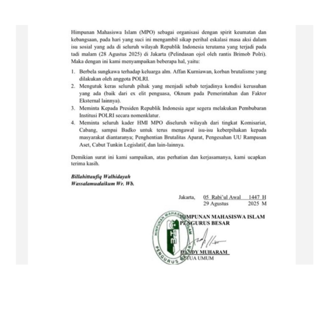 JAKARTA, EDUNEWS.ID — Pengurus Besar Himpunan Mahasiswa Islam (PB HMI) Majelis Penyelamat Organisasi (MPO) mengeluarkan pernyataan sikap yang sangat keras, menuntut Presiden Republik Indonesia untuk membubarkan Institusi Polri. Tuntutan ini muncul menyusul insiden dugaan brutalitas aparat pada 28 Agustus 2025 malam di Jakarta yang diklaim menewaskan seorang pengemudi ojek online, Affan Kurniawan.