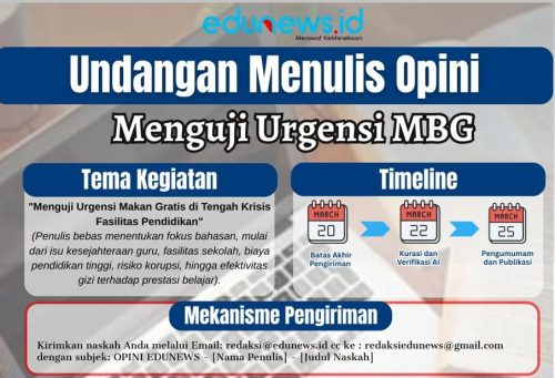 Redaksi edunews.id mengingatkan bahwa batas waktu pengiriman naskah dalam agenda “Undangan Menulis Opini: Menguji Urgensi MBG” tinggal menghitung hari. Hingga hari ini, Senin (16/3/2026), puluhan naskah dari berbagai penjuru tanah air telah masuk ke meja redaksi, membedah pro-kontra anggaran makan gratis yang bersumber dari pos pendidikan.