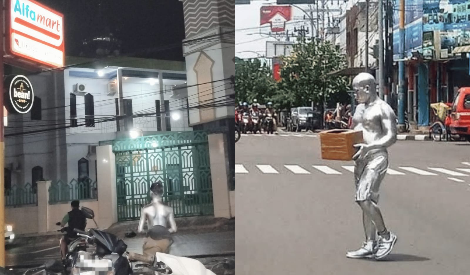 Kolase Foto: Tampak manusia silver di depan gerai Alfamart Jalan Pacerakkang, Kota Makassar, Jumat (20/6/25).